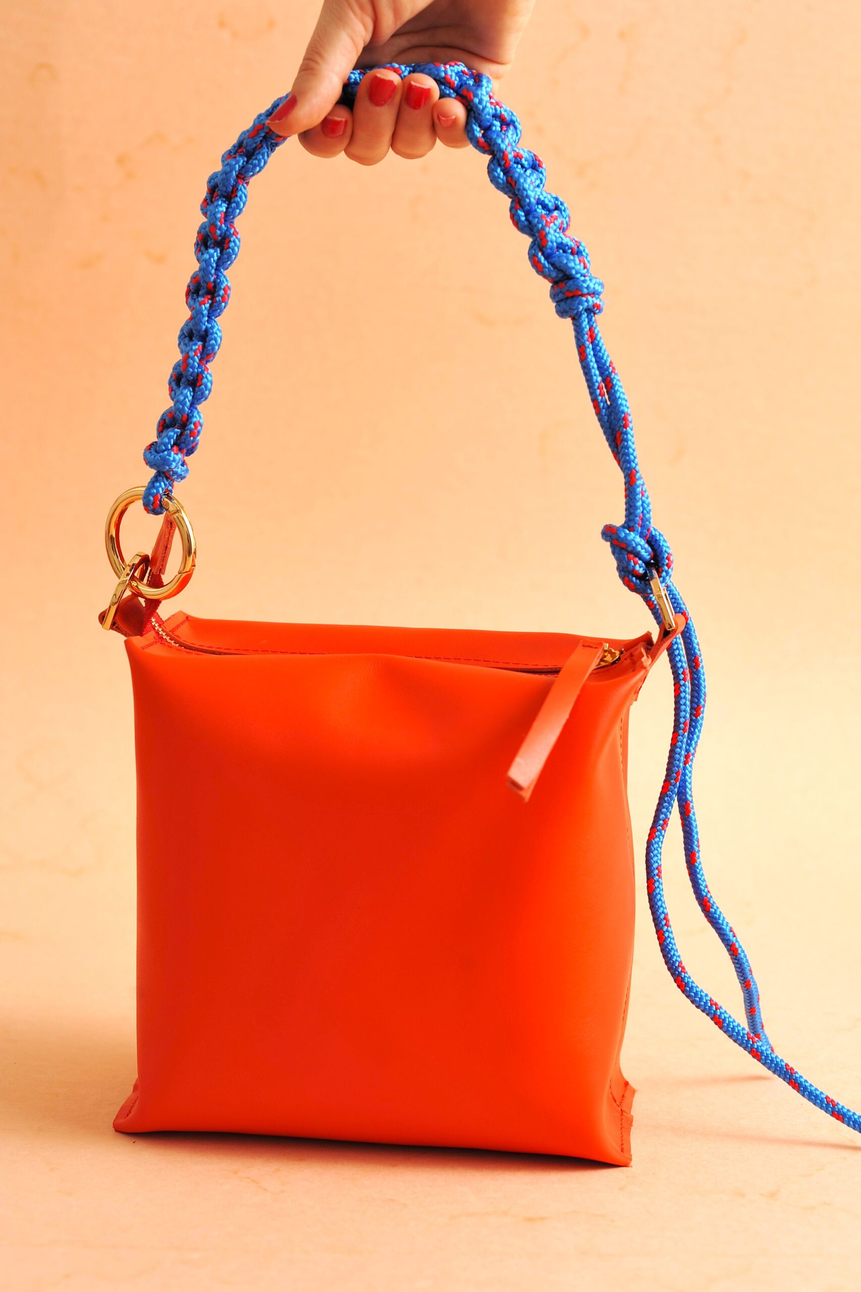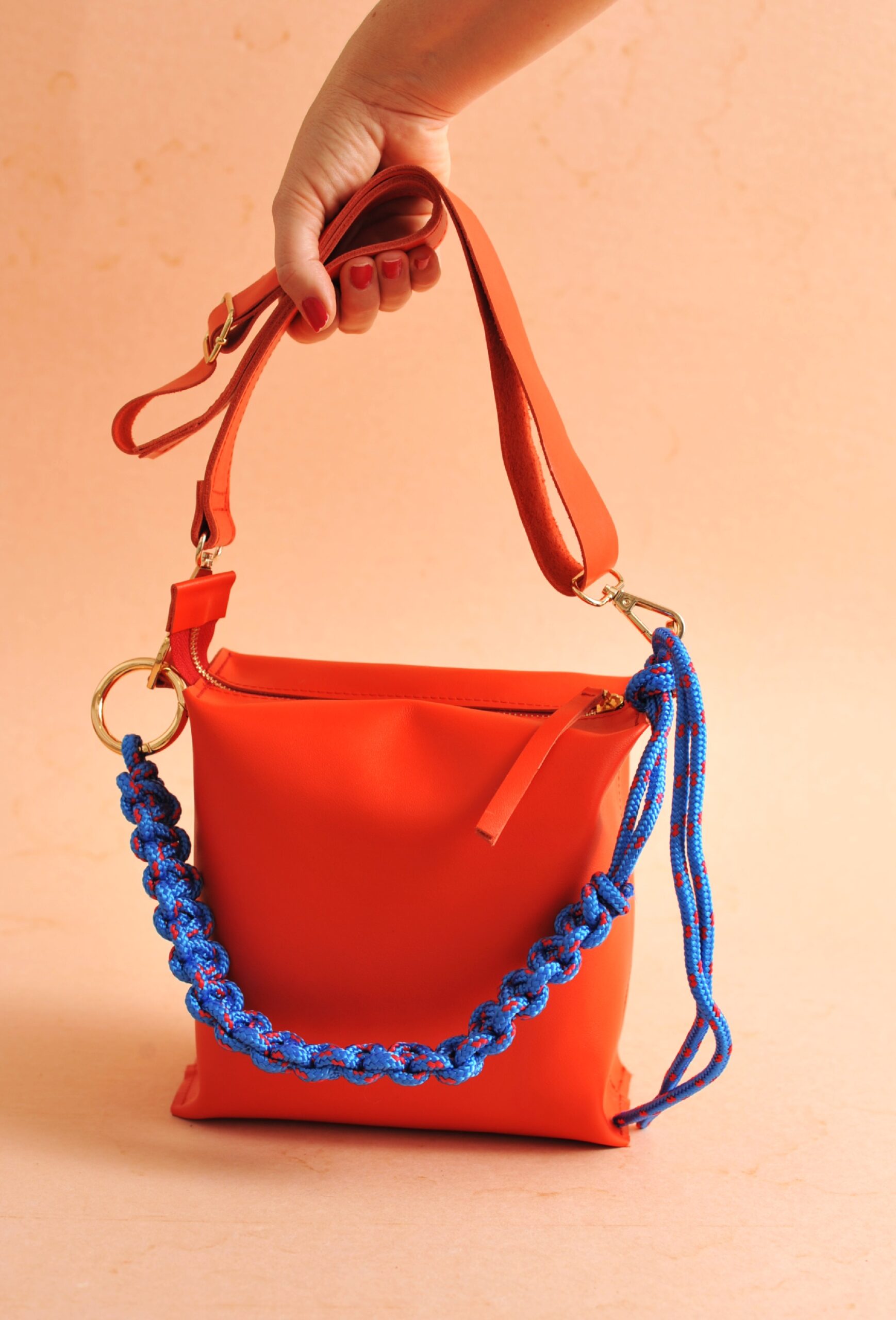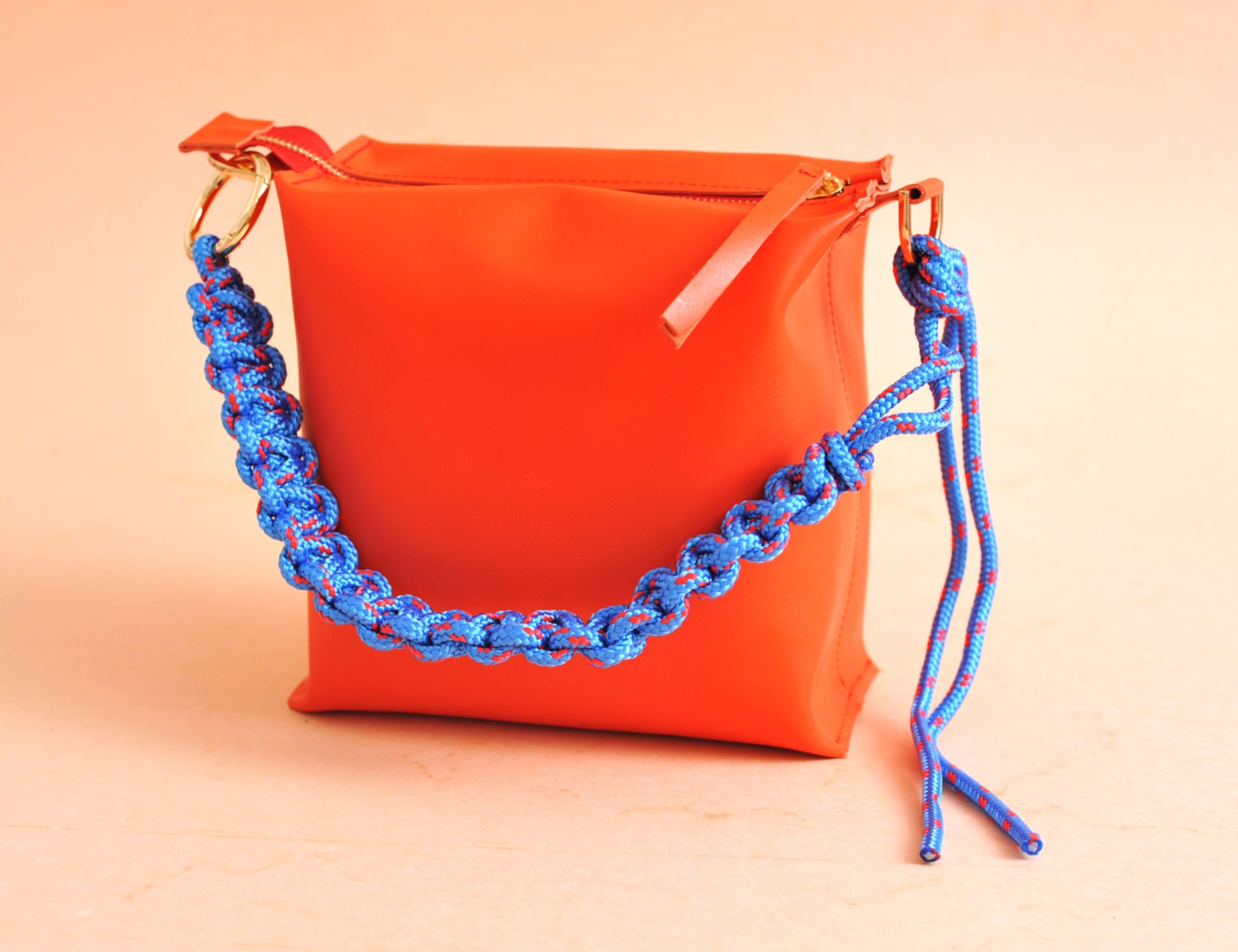 Możesz ją nosić na ramię albo na skos na piersi. Ma regulowany pas oraz oryginalną, krótką plecioną rączkę z linki.